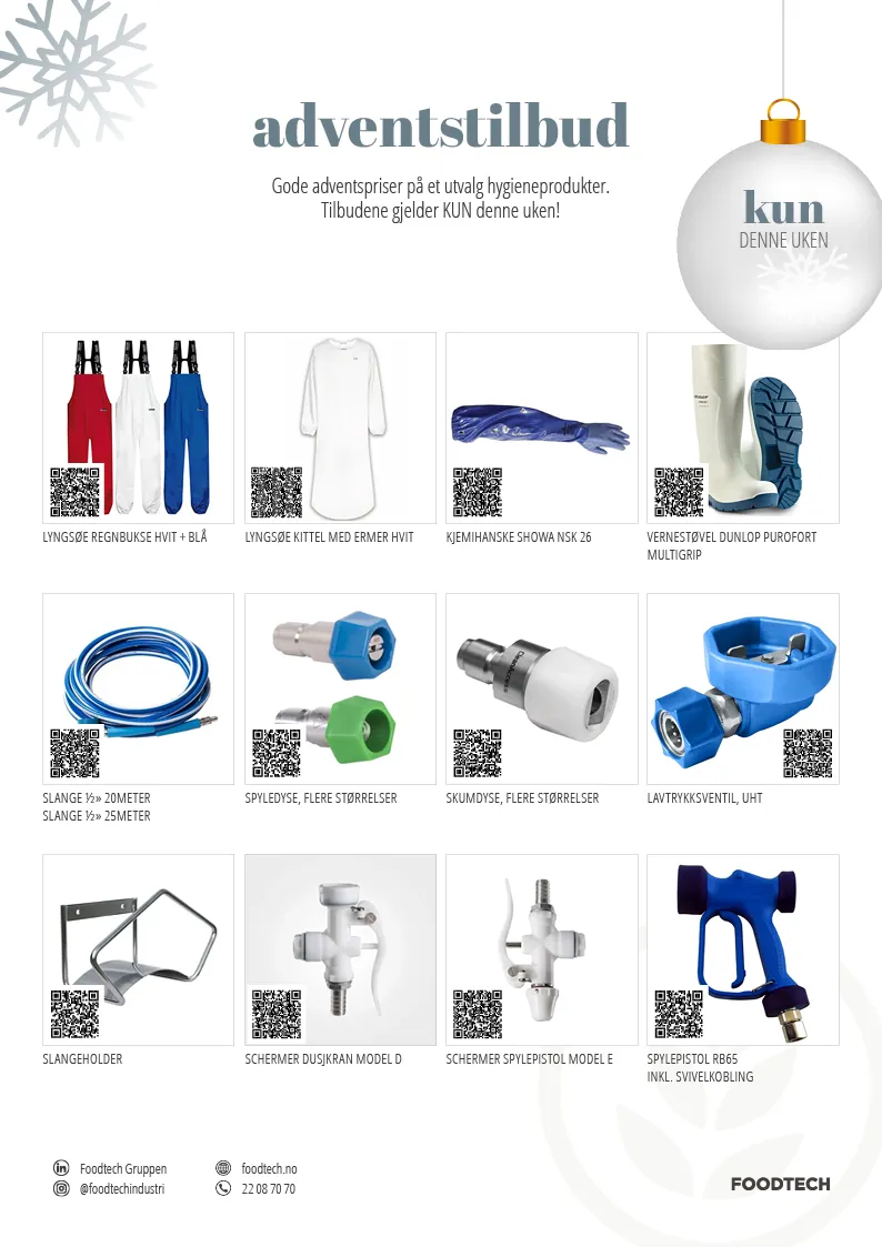 Hver uke frem mot jul presenterer vi utvalgte produkter fra vårt sortiment innen hygiene og driftsutstyr – til ekstra gode kampanjepriser. Først ut er en rekke kvalitetsprodukter innen hygiene for næringsmiddelindustrien, nøye valgt ut for å sikre effektiv drift, høye standarder og trygg produksjon i en travel førjulstid. Utforsk ukens tilbud, sikre deg fordelaktige priser – og følg med når nye produkter lanseres i ukene som kommer!